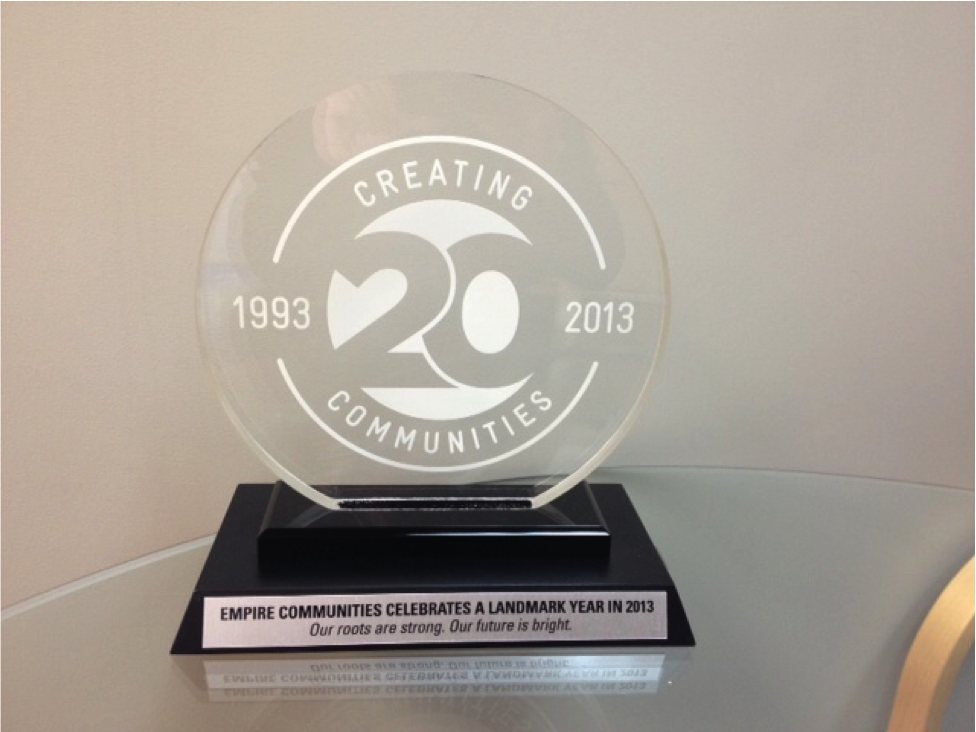 To help our client Empire Communities celebrate their tremendous successes and everything that made 2013 such a landmark year for them, we had this award made to present to them at a special lunch we hosted for their team.