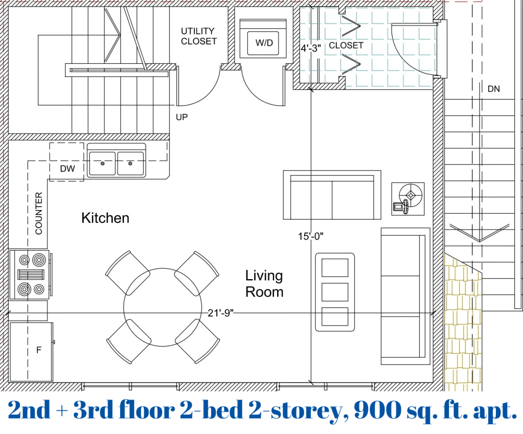 2nd + 3rd floor 2-bedroom 2-storey, 900 sq. ft. apartment