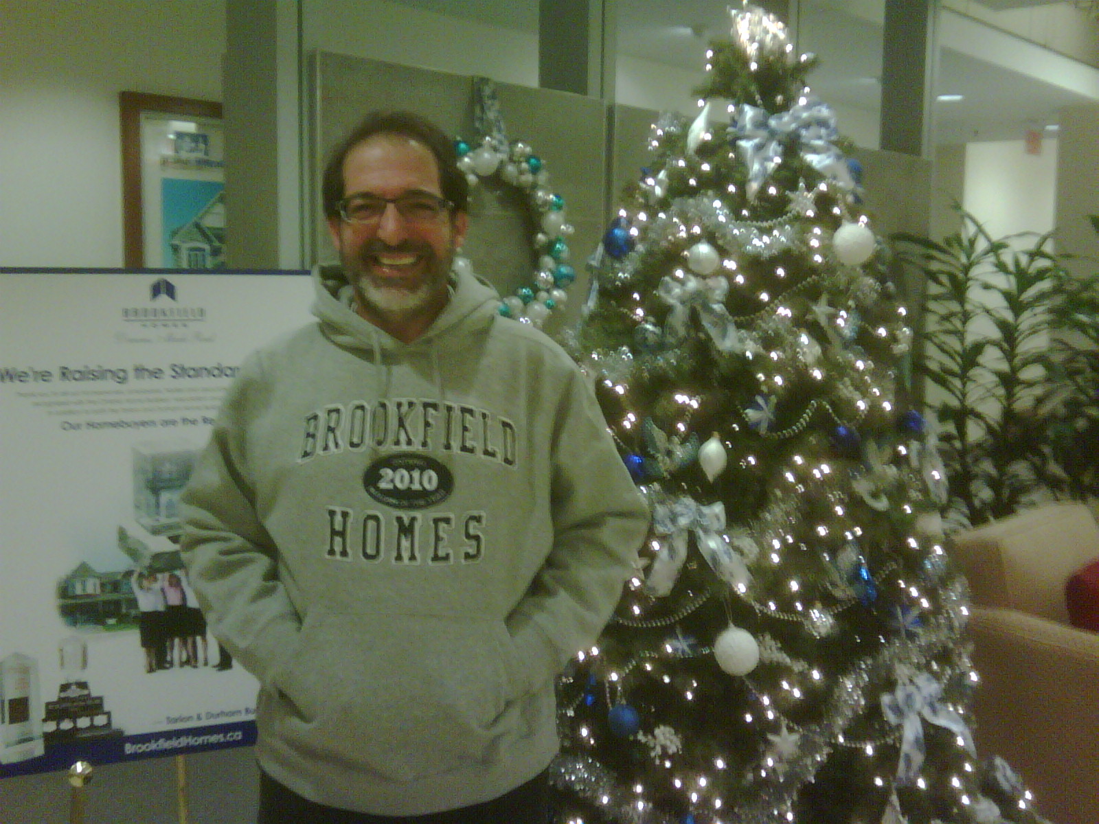 John A. celebrates Brookfield Homes’ “Builder of the Year 2010” award in his new sweatshirt in front of the Brookfield Christmas tree in Markham. Somehow the photo got into the hands of another of our clients, Empire Communities. Maybe it’s an Empire sweatshirt, actually! We love our clients and wear their tattoos with pride.